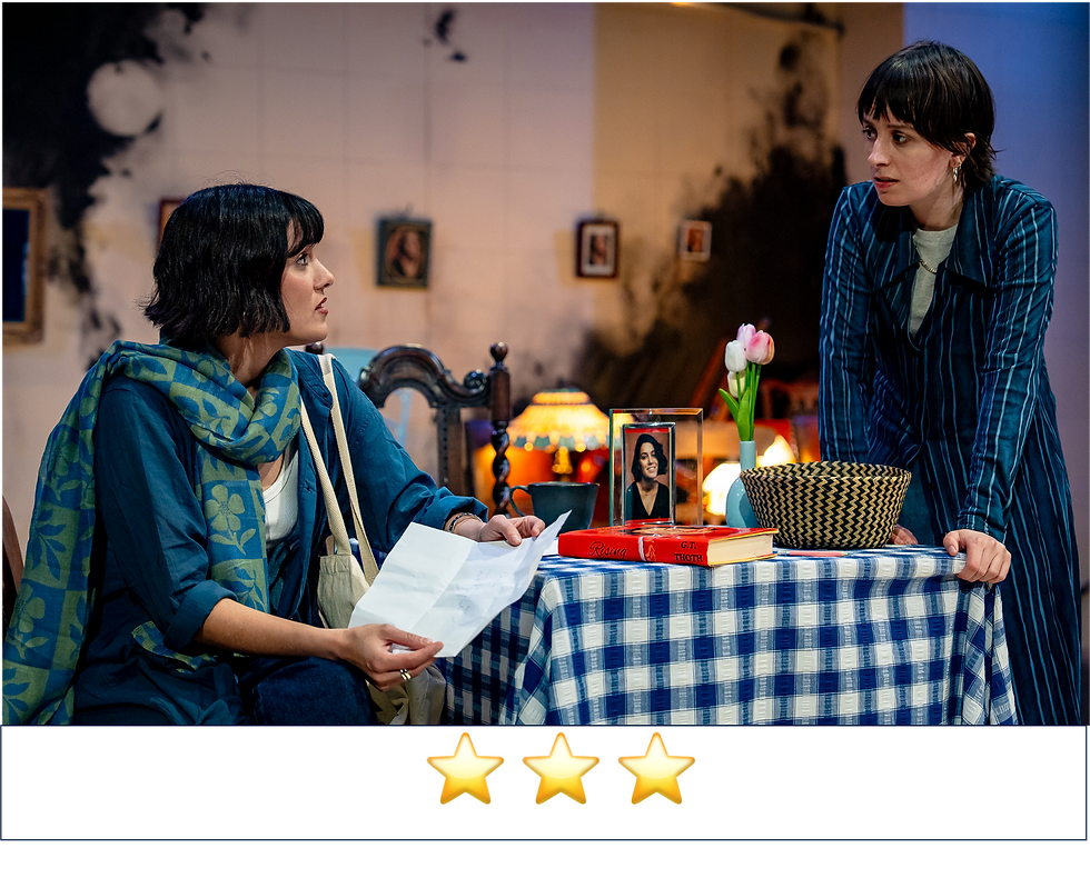 There’s a sense of offbeat eeriness to the cafe, heightened by the inclusion of live music performed by Composer Deniz Dortok and Lydia Cochrane. This accompaniment frequently adds to the comedy or tension of the scenes. However, in some portions of the play, it appears so sporadically that there could be an argument for it not being needed at all. Peiyao Wang’s set design does wonders for the atmosphere of the piece, with blackened walls and tired furniture conjuring a room stuck in its past.